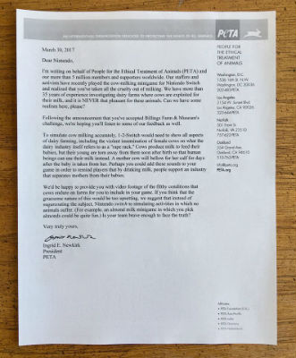 同団体が標的にしたのは「1-2-Switch」に収録された「ミルク」というミニゲーム。コントローラーを牛の乳に見立てて乳しぼりをシミュレートするというものです。同団体は任天堂にあてた書簡で、乳しぼりは牛にとって苦痛であり、ゲームからはその残酷さが排除されていると主張。母牛が生まれたばかりの子どもと引き離されて上げる鳴き声や、汚い牛舎などをゲームに入れるべきとしています。「任天堂はうわべをよく見せかける代わりに、動物が苦しまない活動(例えばアーモンドミルクのミニゲーム)をシミュレートするべきだ」とも。