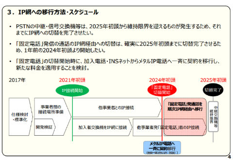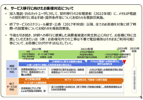 2017年秋ごろにスケジュールを確定させ、それ以降、利用者に終了時期や代替案などの告知を行う。IP網への移行に便乗した詐欺防止に向けて注意点も知らせていく予定。