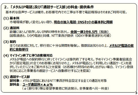 2024年初頭に加入電話・INSネットからメタルIP電話への契約に一斉移行し、新料金を適用することを検討。移行は2025年初頭までに完了させる計画としている。利用者は宅内工事不要で、電話機をそのまま利用可能。