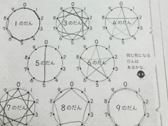 1の段から9の段までを1つずつ図で表すというもの。それぞれの円に0から9までの目盛りが均等に振ってあり、0からスタートしてかけ算の1の位の数字を順番に線で結びます。「1の段」であれば、0→1→2→3→4……となるので十角形が完成します。