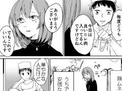 登場人物は、お肉屋さんに“鶏むね肉”を買いにくる若い女性と、そのお店で働くお兄さん。華やかな人に見えていつも「うちで一番安価な肉」を買っていく愛想の良い女性に、「(節約家さんなのかな)」となんとなく考えるお兄さんの視点で物語は進行します。