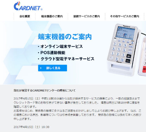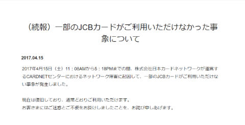 4月15日、一部のJCBカードが利用できない問題が発生した。その後復旧している。