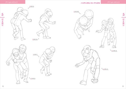 イラストレーターはこれまでさまざまなBL本を手掛けてきたえびも氏。「抱きつく(前後別)」「馬乗り」「おんぶ」「飛びつく」「キスシーン」など、BL作品を彩る数々のシチュエーションが「スタンダード」「マッチョ」「小柄」の3体型でカップリングされ、多数のアイレベル(目線の高さ)・方位から描画。少年漫画風の「デフォルメ」体型も加えた380点のトレースフリーデーターが付属CD-ROMに収められています。