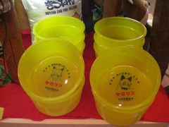 風呂桶は、アニメ第9話に温泉が登場することからコラボすることになった商品(関連記事)。ジャパリパークの温泉管理人であるギンギツネやキタキツネの顔が、銭湯などでおなじみである内外薬品の解熱鎮痛薬「ケロリン」の黄色い風呂桶に配されています。