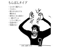 最初に紹介するのは「ちんぱんタイプ」。チンパンジーのようにとにかく騒がしく、常識もないので他人からは嫌われがち。その一方で明るい性格であり、一緒にいるとゲームが盛り上がるので友達が多いタイプです。