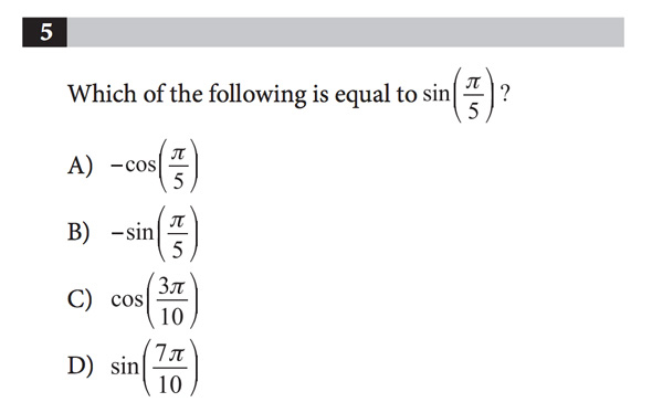 sin(π/5)と等しい三角関数を選ぶ問題。これはさすがに少し難しい……。sin(π/5)もcos(π/5)も正の数なので、AとBは等しくなるわけがない。cos(θ)=sin(θ+π/2)で求められるので、Cのcos(3π/10)はsin(4π/5)に等しい。sin(θ)=sin(π-θ)なので、sin(4π/5)=sin(π/5)。よってCが正解だ。