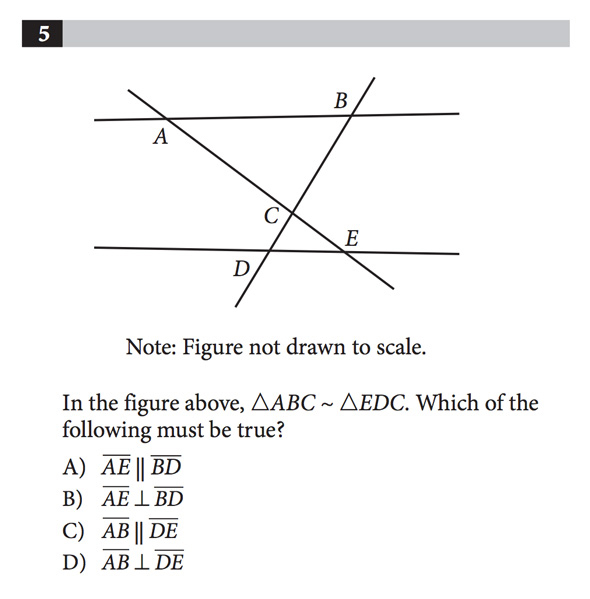 「上の図で、ΔABC∽ΔEDC(∽は相似を表す記号)です。次のうち必ず正しいのはどれでしょう?」