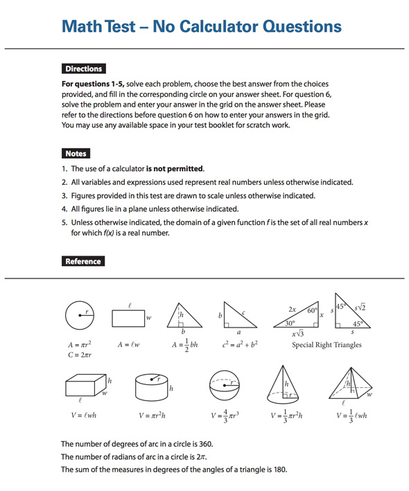 SATの数学が日本の試験と大きく異なる点は、SATの場合電卓の持ち込みができること。「電卓を使わないで解く問題」と「電卓で解く問題」が用意されており、「電卓で解く問題」にはグラフが表示できる程度の高機能な電卓が持ち込める(四則演算しかできない電卓は「推奨しない」とまで書いてある)。