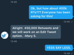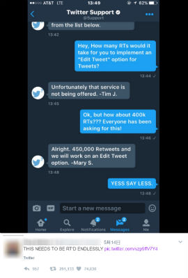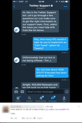 問題の投稿は、TwitterサポートBotとの会話のスクリーンショットのような形になっており、「45万RTでツイートの編集オプションを提供する」というサポートBotの回答が見られます。