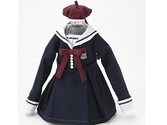 デザインは紺色がメインの冬服系で、襟とカフスは白、胸元のリボンとフタ用のベレー帽はエンジ色、左胸には同校の校章が入り、取り外し可能な白のパニエが付属しています。
