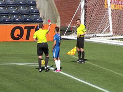 ピッチの隅でもどしてしまう副審。これにはジョーダン選手も困惑