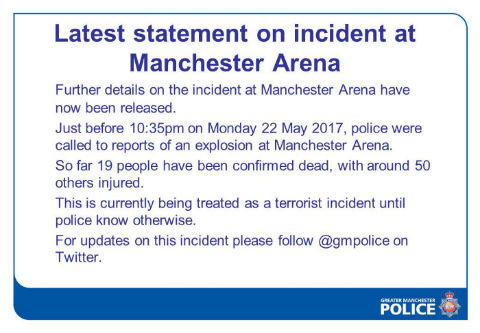 グレーターマンチェスター警察は、これまでに19人の死亡が確認されたと発表。約50人の負傷者が出ているとしています。事件は現在テロとして扱われていることも明らかにしています。