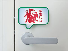 ライトのパネルには警告文が描かれており、2個1組をドアノブ付近へ挟み込むように、磁石で貼り付けて使います。片方のセンサーが人を感知すると、もう一方のパネルが約2秒間点滅。警告で扉にぶつかる事故を未然に防ぎます。