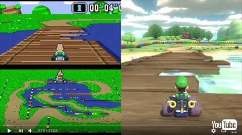 スーパーファミコン向けに発売された初代「スーパーマリオカート」のほか、ゲームボーイアドバンスやニンテンドー64、Wiiなどで発売された歴代シリーズから、選りすぐられた名コースをリメイク収録。映像は元となったコースとリメイク版を並べて、その進化ぶりを見てみようというものです。