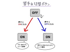 投稿したのはTwitterユーザーのLV41(@lV41_)さん。描かれていたのは灰色の四角形に「OFF」とだけ描かれた平面のイラストでした。これだけでは“押すとオフになる”というアクションを示しているのか“今はOFFだけど、押すとオンになる”という現在のステータスを示しているのかが分からないため、LV41さんは表示方法を統一するよう提言。同時に投稿された漫画には、爆弾の起爆スイッチがこの方式で画面上に表示されたものだったため、解除できず爆発してしまう様子も描かれました。特に画面上でフラットに表示された場合、視覚的な感触が得られにくいために混乱しやすくなっているようです。