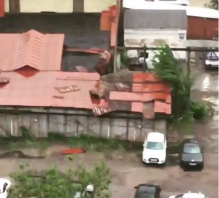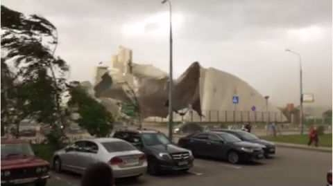 ロシアのモスクワで激しい嵐 コートの屋根がビリビリになって飛ばされる激しさ