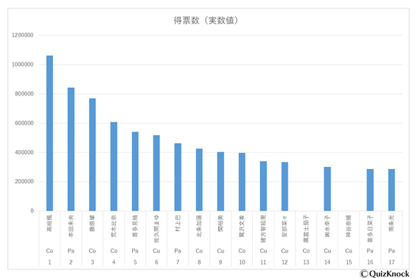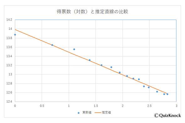 残念ながら誤差の犠牲となってしまったようだ。仕方ないので、14位と16位の数値をy=A×(x^b)の式に当てはめてAとbを求め、そこから15位の得票数とした。