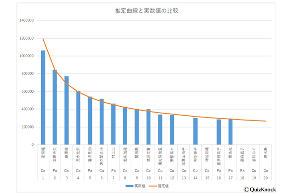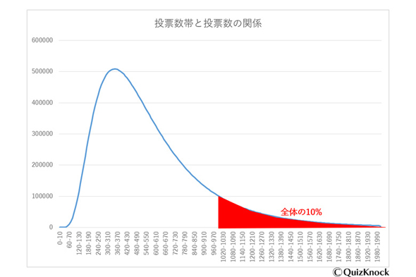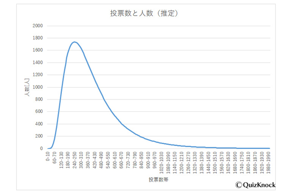これらを踏まえ、投票数に対する人数の変化が対数正規分布(所得配分の推定などに用いられる)に従うと仮定して、画像のような曲線を求めた。