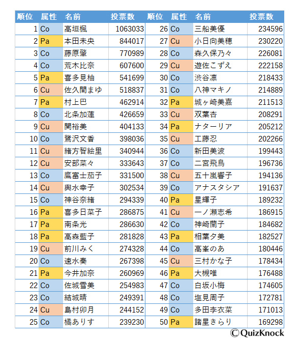 そう、得票数が発表されたのは、全体のトップ10と各属性(※)のトップ5まで。神谷奈緒は全体15位なので、何票獲得したのかが分からないのだ。