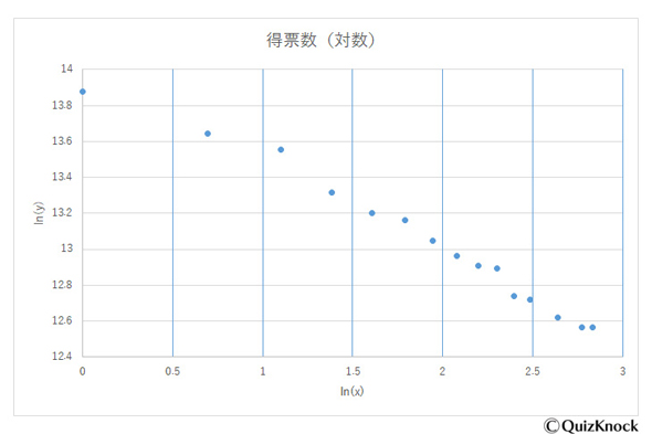 どうやら指数関数で近似できそうなので、順位と得票数の対数をとってプロットしてみた(「In(x)」は「底をe(=自然対数)としたxの対数」のこと)。このグラフに直線を引いてみよう。