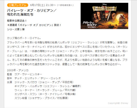 6月17日に第1作「呪われた海賊たち」、24日に第2作「デッドマンズ・チェスト」、7月1日に第3作「ワールド・エンド」、8日に第4作「生命の泉」を放送。6月17日のみ21時30分から。他は21時からです。