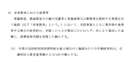 新規定では、年間の包括的利用許諾契約の場合、使用料は受講料収入の2.5%とする。「楽器教室、歌謡教室その他の受講者に楽器演奏又は歌唱等を教授する事業を行う施設」が対象。