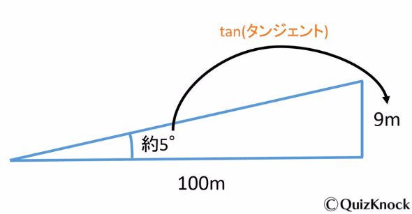 詳しく書くと、tan 45度が1(100%)、tan 5度が約0.087(約9%)というように、角度から勾配の数字を計算できるのがタンジェントというものなのです。