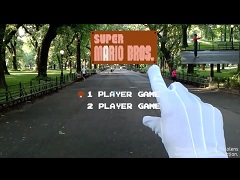 プレイ場所はニューヨーク・セントラルパークの歩道。画面にはスーパーマリオブラザースのロゴと、「1 PLAYER GAME」「2 PLAYER GAME」の選択画面が出現します。2人でプレイするとどうなるのか気になりますが、動画では「1 PLAYER GAME」を指先でつまんで、いざゲーム開始です。