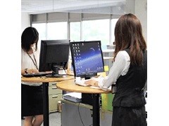 同社では、漫然とした長時間のPC作業を避けるため、自席にPCを置くことを禁止するなど使用制限を2007年から設けていました。PCを使用する場合は、別途設けられたPC専用のデスクに移動する必要があり、一回あたりの使用時間の上限を45分に制限しています。ただし、この制度はPC用スタンディングテーブルへ移行したら、順次撤廃するとのこと。