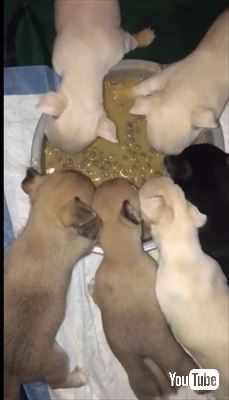 大きな器に入れられた子犬用の柔らかいご飯を夢中で食べているワンコたち。半分顔がご飯で汚れても気にせずに食べています。