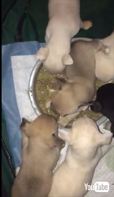 ご飯に夢中になっている子犬に起こったハプニングとは……?