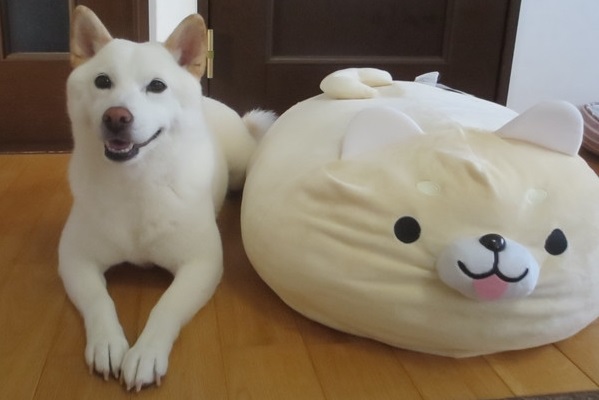 中から出てきたのは“もちもちクッション”。しかも、きなこちゃんによく似た白柴さんのデザインです。匂いを確かめたり、お顔を乗せてもちもち具合を確かめたり、隣に並んで記念撮影をしたりするきなこちゃん、なんだかうれしそうです。