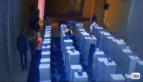 事故が起きたのは14th Factoryというアートギャラリー。王冠を飾った台座が並んでいる前で自撮りをしようと、女性が展示作品を背にして後ろに向きに進んだところ、背中が台座に当たって台座がドミノ倒しのように倒れていく様子が動画で公開されています。米メディアによると損害額は約20万ドル(2250万円)に上るとのこと。