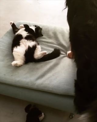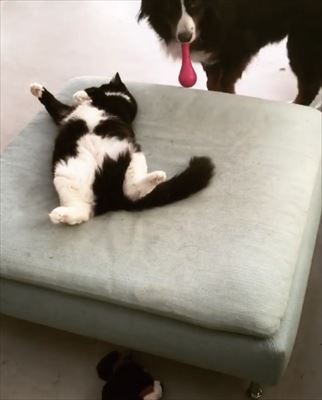 仰向けになり椅子の上でくつろいでいる猫ちゃん。そこへ、ワンコがおもちゃの骨をくわえてやって来ました。