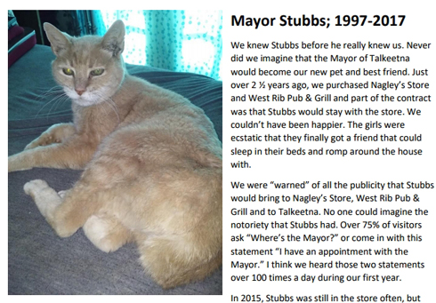 米国アラスカ州タルキートナの「猫市長」として知られていたスタッブス(Stubbs)が天に召されました。20歳3カ月でした。