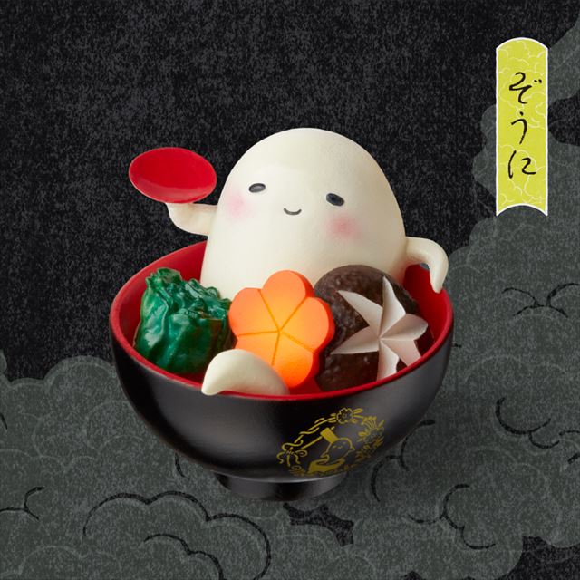 「もちばけ 弐の巻」は、おもちと野菜がお椀に入った「ぞうに」、黄緑色のあんをまとった「ずんだ」、のりで巻かれてこんがり茶色の「いそべ」、3つ重なって串に刺さった「はなみ」、黒豆が入った「おまめ」の5種類。どれものほほんとした表情でキュート。
