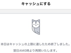 その後確認すると、12時14分時点で残り29万6900円、12時16分時点で残り11万1900円となり、12時17分にはキャッシュ上限に達して終了。再開初日とはいえにわずか2時間強でキャッシュ上限に達するあたり、関心の高さがうかがえます。なお、限度額は午前10時にリフレッシュされ、取引再開予定とのことです(お知らせページでは午前11時との説明もあり、どちらが正しいかは現在問い合わせ中)。