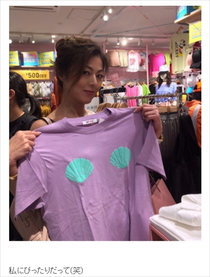 タレントの武田久美子さんが8月24日、伝説の“貝殻ビキニ”ならぬ“貝殻Tシャツ”を体にあてがった写真をブログで公開しました。オーダーメイドかな?