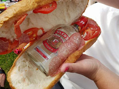投稿された画像には、大きなパンにはさまれた酒瓶が。横から見ても分からないよう工夫したのか、しっかりトマトやサラミもあしらわれています。ツイートは多くを語っていませんが、ズルがバレた原因はおそらく“重さ”でしょうね。