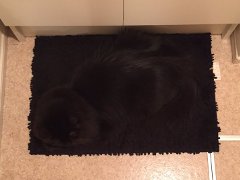 投稿した飼い主の紗妃(@narisaki1)さんによると、危ないためいつもはベージュ色のマットを使っているそうで、今回は洗濯中の代用として置いておいたところ、見事な擬態化が披露されることに。「そこだけはやめてよぉ」というツイートの通り、ピンポイントに黒いマット上で落ち着いてしまったがんちゃんでした。