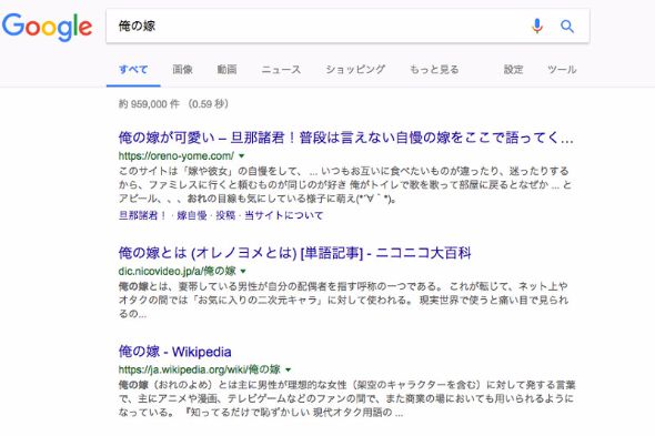余談だが、「俺の嫁」と検索すると「俺の嫁が可愛い」という投稿型サイトが1番上にヒットした。中をのぞいてみると、リア充が自身の妻や彼女を自慢し、ノロケるというものであった。