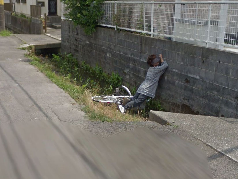 ストリートビューに写っていたのは、撮影車に驚いて運転を誤ったのか、道路脇の用水路に落ちそうになっている自転車の女性。カメラの位置を変えると、向こう側から走ってきた自転車がふらつき、落ちそうになるまでの様子がまるでコマ撮りアニメのような連続写真で捉えられてしまっています。確かに酷いことになってた。