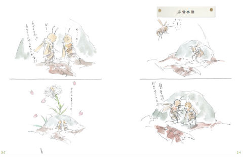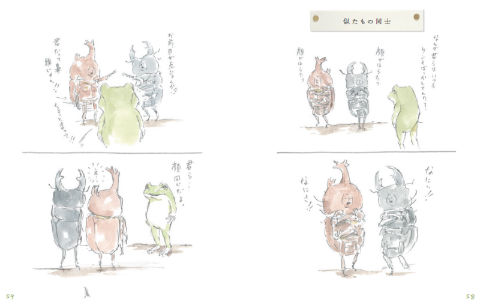 ネットで話題になった、オタマジャクシから「なんで大人になるとカエルになるの?」と聞かれ、思わず「神に聞いて」答えるカエルをはじめ、社畜過ぎるアリたちの生活、甘酸っぱいコオロギたちの青春などを掲載。書籍限定の描き下ろしも多数あるとのこと。