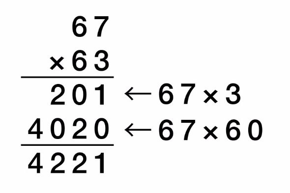 小学校で習うこの筆算は、67×63を、(67×3)+(67×60)として計算しています。この方法では、5秒で解くのは厳しいですよね。