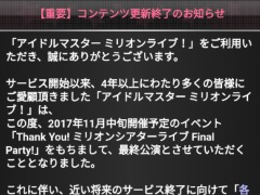 バンダイナムコエンターテインメントが運営・提供しGREEが配信するソーシャルゲーム「アイドルマスター ミリオンライブ!」が、“近い将来のサービス終了”を発表しました。これに伴い、11月中旬に最後のイベントとなる「Thank You!ミリオンシアターライブ Final Party!」を実施し、12月から「各種コンテンツの終了・更新停止および仕様の一部変更」を行います。