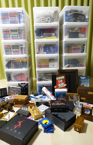 もちろん、平均的価格帯のものや比較的安価のものにも、ハズレは多くあります。というか、高確率でハズレです。ただ、この「ハズレ」というのは、「まったく使えない」というのではなく、「面白いことは面白いし、1回くらいは使ってみたいけど、何回も演じる気にはならないな」というものを含みます。そのため奇術道具の沼につかったひとは、奇術道具を買う→しまい込む、というルーティンを繰り返すことになります。その結果が、例えばこんなかんじです。
