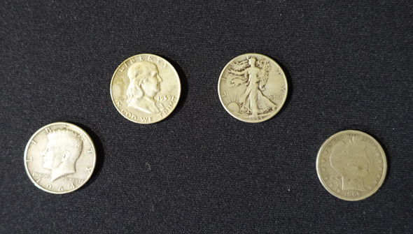 マジックでよく使われるコイン(左から、ケネディ、フランクリン、ウォーキングリバティ、バーバー)。それぞれに愛好者がいる