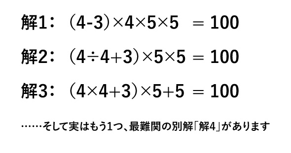 さて、この「Make 100」の問題、実は最も難しいのは、Q1のあと1つの別解なのです! ただし、上記解答例の移項や変形で作れる別解ではなく、「5,4,5,3,4」の順番で作れる別解に限ります。余力のある方はぜひチャレンジしてみてください。
