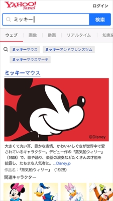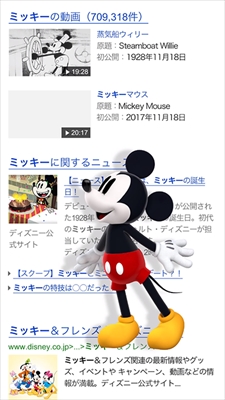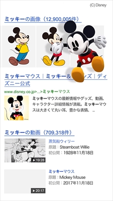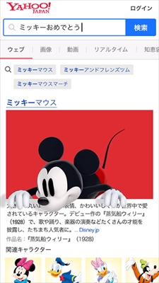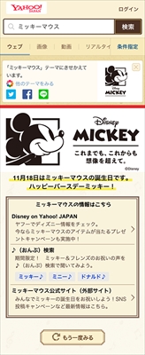 2人の誕生日を記念して、スマートフォン版「Yahoo!検索」では「ミッキー」または「ミッキーマウス」を検索すると、検索画面でミッキーが飛び出して動き回る企画も実施しています。検索結果を音で答える「♪(おんぷ)検索」では、ミッキーの仲間たちからのお祝いメッセージを聞くことも可能です。