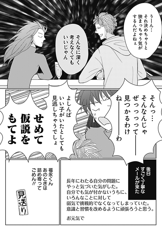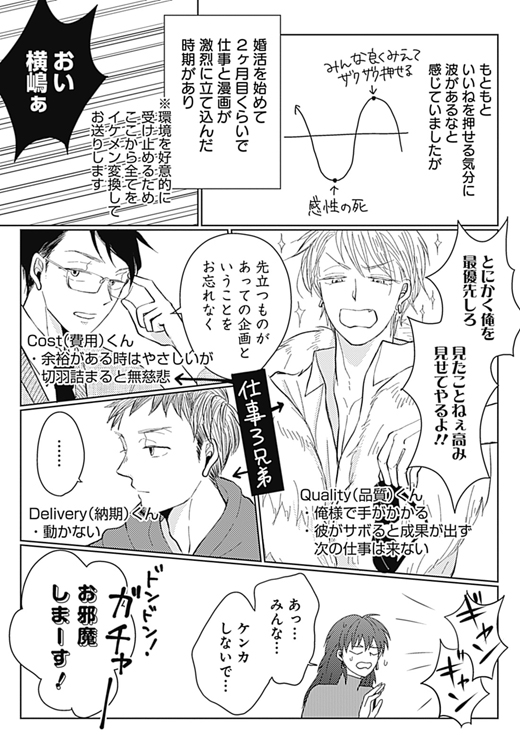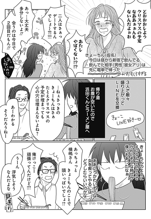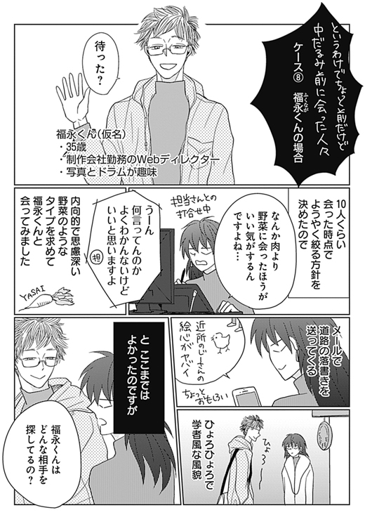 ――横嶋さんからの「どんな相手を探してるの?」という質問に、「うーん…それ決めちゃうと狭まっちゃう気がするんだよねぇ そんなに深く考えなくてもいいじゃん」とふんわり答えた彼に、「せめて仮説を持てよ!」と詰め寄るシーンもあります。